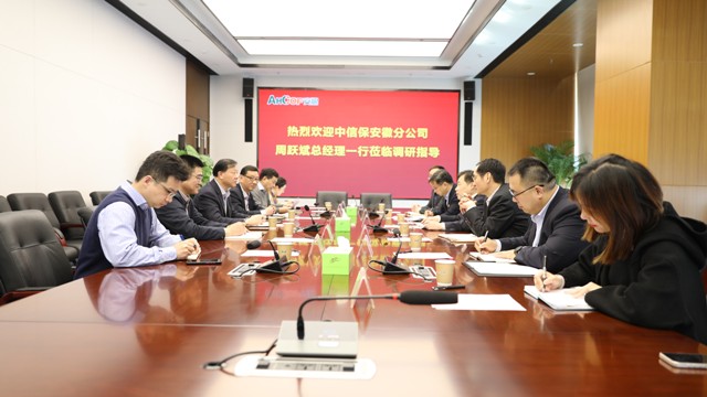 3月3日下午,中信保安徽分公司黨委書記、總經理周躍斌帶隊來公司調研,曹訓立董事長熱情接待了周躍斌總經理一行并舉行調研座談,周洪、吳國杰、朱亮及相關部門負責人參加座談會。
