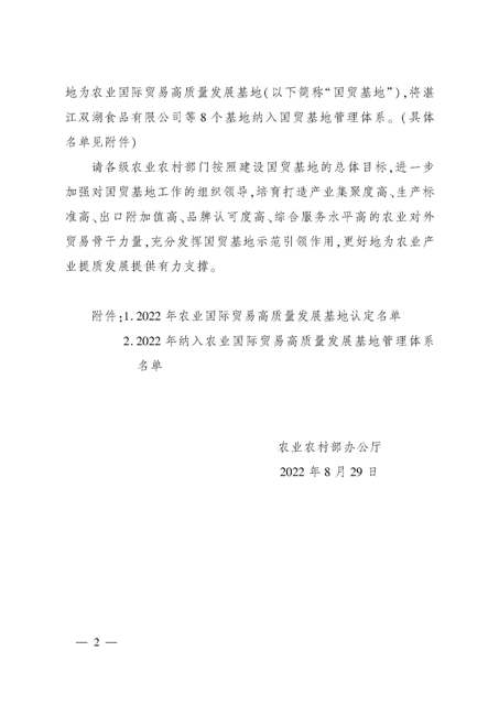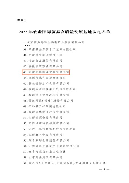 日前,農業農村部發布了《關于認定2022年農業國際貿易高質量發展基地的通知》,經省級推薦、專家評審、綜合評議和公示,認定安徽安糧實業發展有限公司等116個基地為2022年農業國際貿易高質量發展基地。