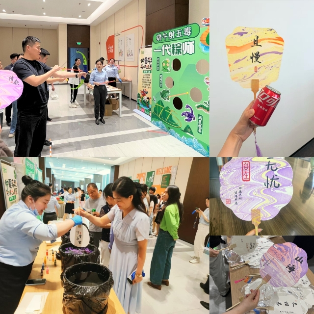 529,在公司餐廳開展的仲夏奔赴?美味出粽端午趣味活動,吸引眾多員工熱情參與。活動現場最具人氣的端午射五毒游戲,參與者手持弓箭瞄準背景板上的蛇、蝎等五毒圖案,在體驗傳統民俗競技樂趣的同時,寄托驅邪避毒、祈福安康的心愿。同步開展的非遺漆扇制作活動讓員工通過親手創作進一步深化對非遺文化的認知。成品扇子上,“山海”“無憂”“且慢”等字樣與端午元素、傳統書法相映成趣