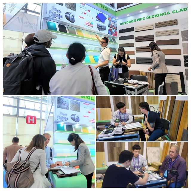 在建材展區(qū),同樣亮點(diǎn)紛呈。安糧以“適配性”和“實(shí)用性”贏得客戶認(rèn)可。展區(qū)重點(diǎn)展示的室內(nèi)地板、墻板及格柵等產(chǎn)品,可實(shí)現(xiàn)“墻地一體化”裝修,為客戶提供高效、整體的空間解決方案。其中,UV亮面墻板因安裝便捷省時的特點(diǎn),成為現(xiàn)場咨詢量最高的產(chǎn)品之一。值得關(guān)注的是,“波浪瓦” 作為本次展出的核心亮點(diǎn)產(chǎn)品,憑借其卓越的防水與排水性能、隔熱與保溫、防火阻燃等特性,吸引了來自南美和非洲區(qū)域的多位客戶,目前已與阿根廷、津巴布韋和幾內(nèi)亞等國客戶達(dá)成初步合作意向。